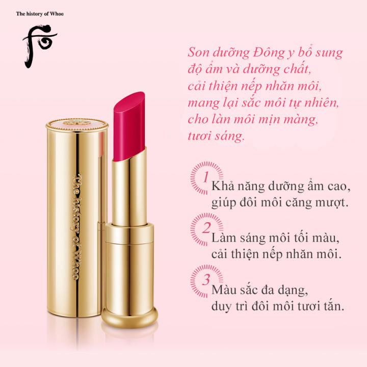 Son dưỡng môi Đông y The History of Who với SPF10 giúp môi bóng mượt và bảo vệ hiệu quả. Sản phẩm cao cấp từ Hàn Quốc có nhiều màu sắc như hồng, đỏ, cam, phù hợp cho nhiều loại da và nhu cầu sử dụng khác nhau. – Lazada